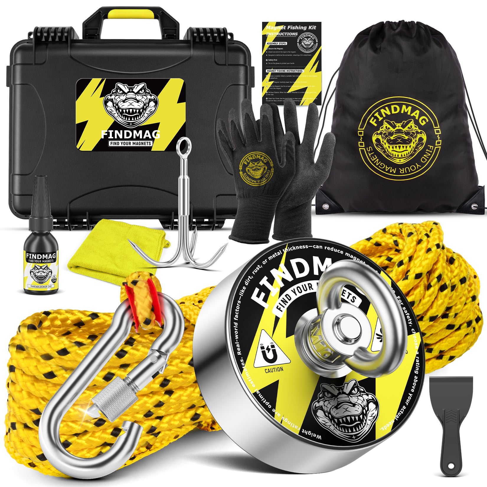 - ⚓Professional Fishing Magnet Kit - FINDMAG offers a complete high-performance fishing magnet kit, including a 2.95-inch N52 grade powerful magnet, 65ft nylon rope with two carabiners, cut-resistant gloves, 3-pronged hook, 242 thread locker glue, durable backpack, scraper, microfiber towel, and a protective case. Whether you're a beginner or an experienced treasure hunter, this kit has everything you need.